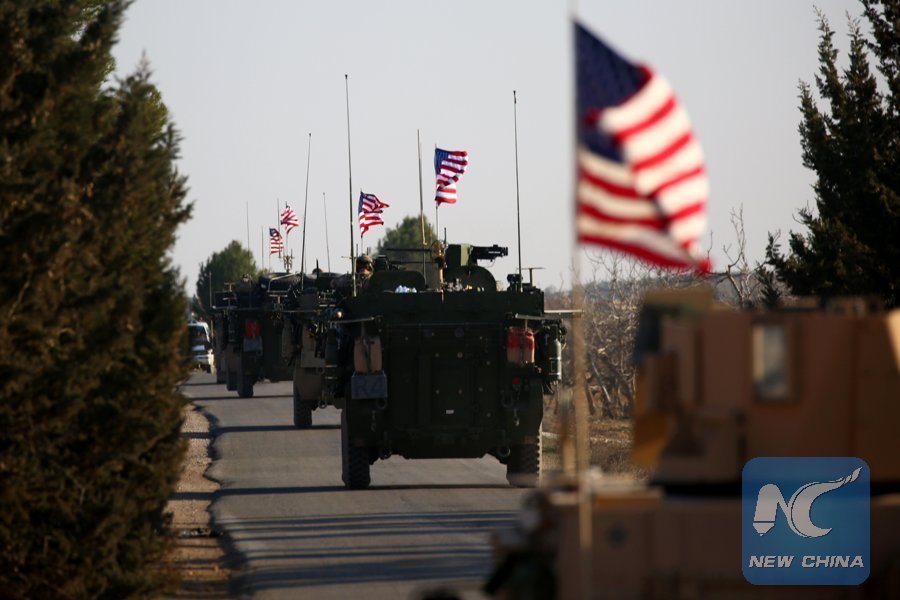 A convoy of U.S. forces' armoured vehicles drives near the village of Yalanli, on the western outskirts of the northern Syrian city of Manbij, on March 5, 2017. (Xinhua/AFP)