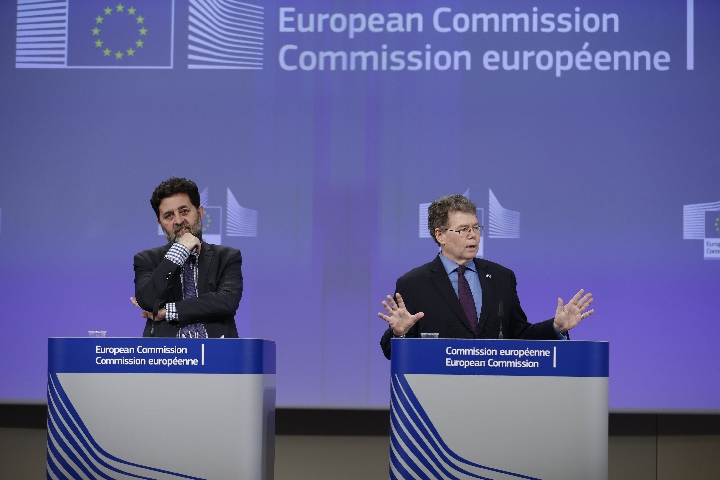 EU TTIP chief negotiator Ignacio Garcia Bercero (L) and his U.S. counterpart Dan Mullaney attend a press conference after the 12th round of negotiations for the Transatlantic Trade and Investment Partnership (TTIP) at the European Commission headquarters in Brussels, Belgium, Feb. 26, 2016. (Xinhua/Ye Pingfan)