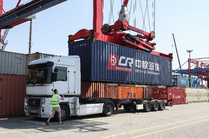 A cargo container of China Railway Express train is loaded on a truck at Eurokombi terminal in Hamburg, Germany, on May 29, 2018. (Xinhua/Shan Yuqi)