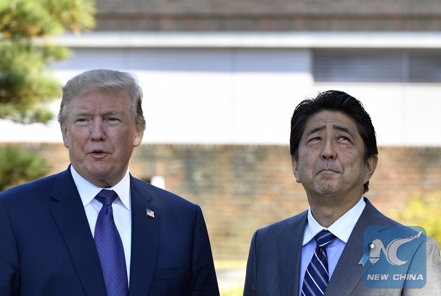 File Photo: U.S. President Donald Trump (L) meets with Japanese Prime Minister Shinzo Abe upon his arrival at the Kasumigaseki Country Club in Kawagoe, near Tokyo, Japan, Nov. 5, 2017. (Xinhua)