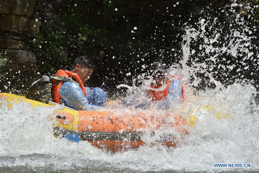 Tourists drift down a brook in Tianheshan scenic spot in Xingtai, north China's Hebei Province, June 10, 2018. (Xinhua/Chen Lei)