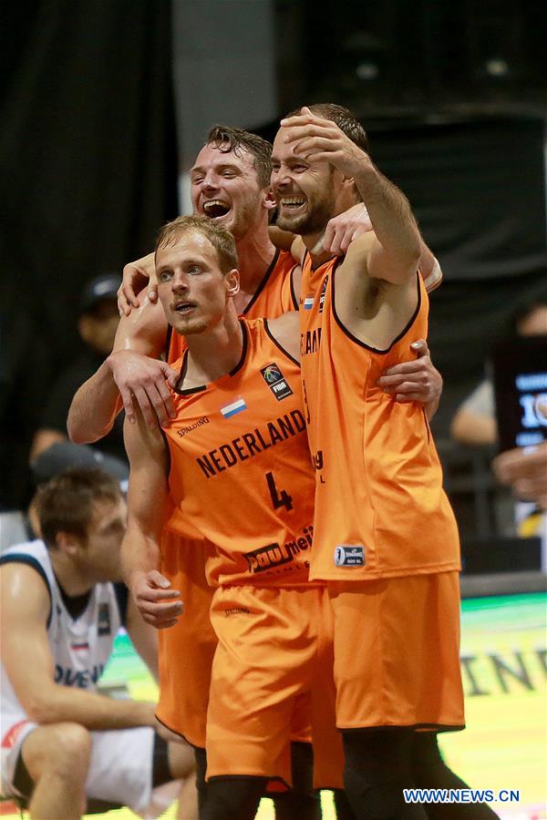 Players of the Netherlands celebrate after winning against Slovenia during the men's semifinal match at the FIBA 3x3 World Cup in Bulacan Province, the Philippines, June 12, 2018. The Netherlands won 21-16. (Xinhua/Rouelle Umali)