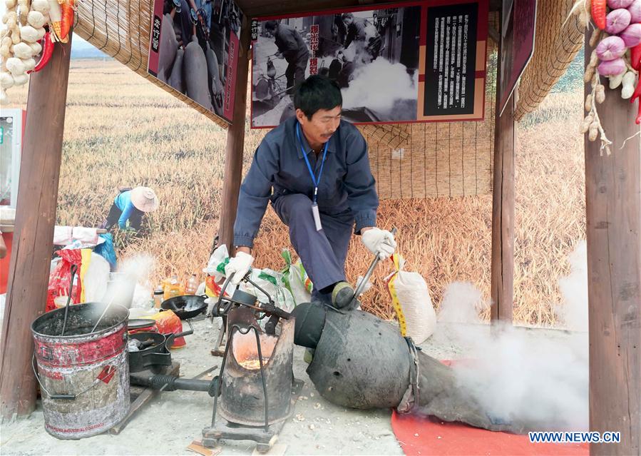 An inheritor performs making popcorn during a four-day cultural heritage festival in Nanjing, capital of east China's Jiangsu Province, June 15, 2018. Ancient cultural heritages were displayed on the festival to call for people's attention on traditional culture that may fade away as the time goes by. (Xinhua/Chen Jianli)