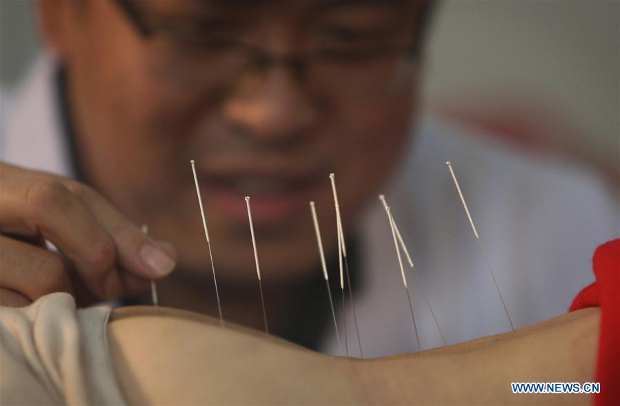 File photo taken on March 11, 2011 shows a doctor practicing acupuncture at a clinic in Beijing, capital of China. Traditional Chinese medicine (TCM), one of the world's oldest forms of medicine with different practices including acupuncture, bee-sting therapy, cupping, moxibustion, scrapping, tui na (Chinese therapeutic massage), still prevails in the modern society after thousands of years of evolution, during which generations have restored and maintained health depending on it. The World Health Organization disease index was updated to include references to traditional Chinese medicine for the first time in June 2018. (Xinhua)