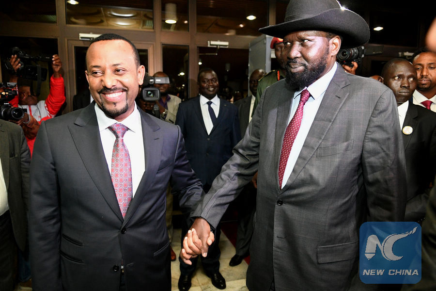 South Sudanese President Salva Kiir (R) meets with the Ethiopian Prime Minister Abiy Ahmed in Addis Ababa, capital of Ethiopia, June 20, 2018. Salva Kiir and rebel leader Riek Machar were due on Wednesday to discuss issues on governance and security which remain sticky issues among the warring parties when the leaders would meet in the Ethiopian capital, a senior official revealed. (Xinhua/Michael Tewelde)