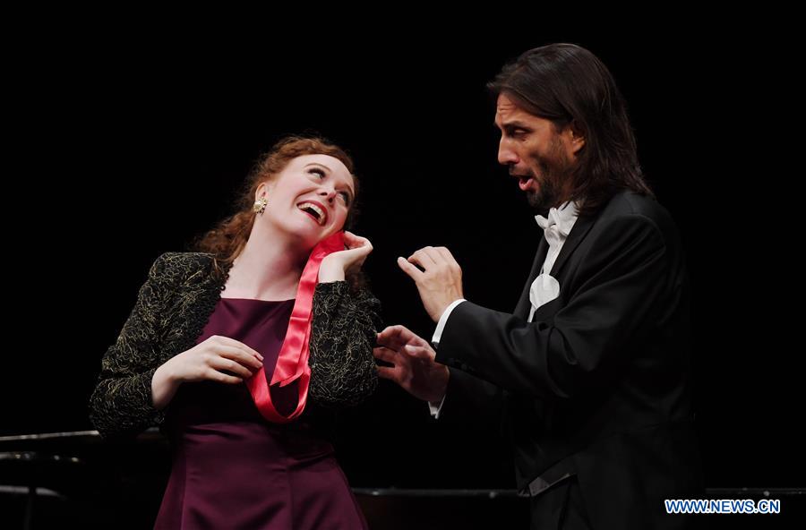 Morgan Harrington (L) and Andrea Zaupa sing a Chinese song at Herbst Theatre in downtown San Francisco, the United States, June 30, 2018. Hao Jiang Tian, a veteran Chinese American opera bass singer who has played with New York's Metropolitan Opera for over 20 years, brought a group of Western tenors and sopranos to San Francisco for the first time on Saturday night to sing some of the most popular Chinese songs in a Western style to nearly 1,000 American and Chinese audience. (Xinhua/Wu Xiaoling)