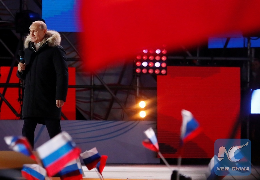 File Photo: Russian President and Presidential candidate Vladimir Putin delivers a speech during a rally and concert marking the fourth anniversary of Russia's annexation of the Crimea region, at Manezhnaya Square in central Moscow, Russia March 18, 2018. (Xinhua/REUTERS)