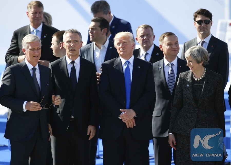File Photo: King Philippe of Belgium, NATO Secretary General Jens Stoltenberg, U.S. President Donald Trump, British Prime Minister Theresa May (from L to R, front) and other NATO member states leaders watch air show at the handover ceremony of the new NATO headquarters during a one-day NATO Summit, in Brussels, Belgium, May 25, 2017. (Xinhua/Ye Pingfan)