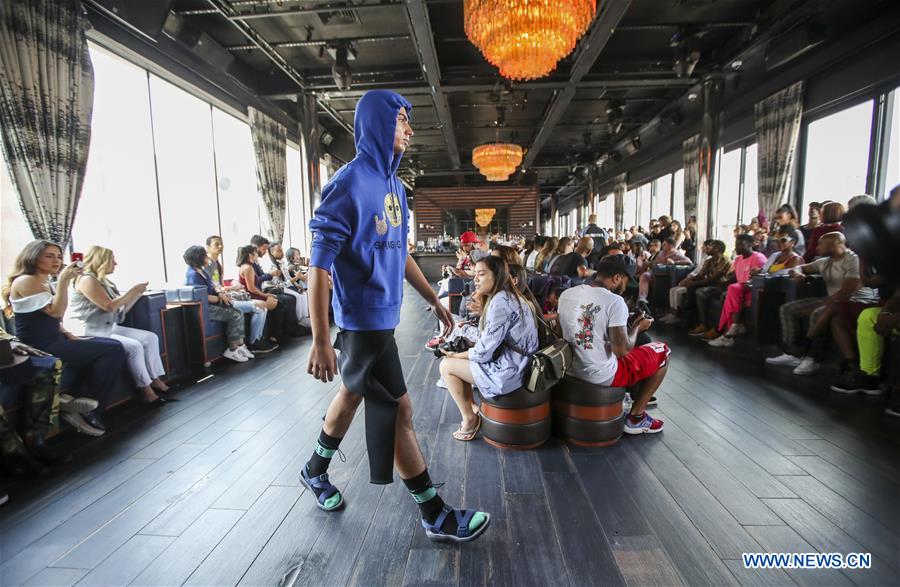 A model presents a creation during Romeo Hunte Spring 2019 Men Runway show in New York, the United States, on July 11, 2018. (Xinhua/Wang Ying)