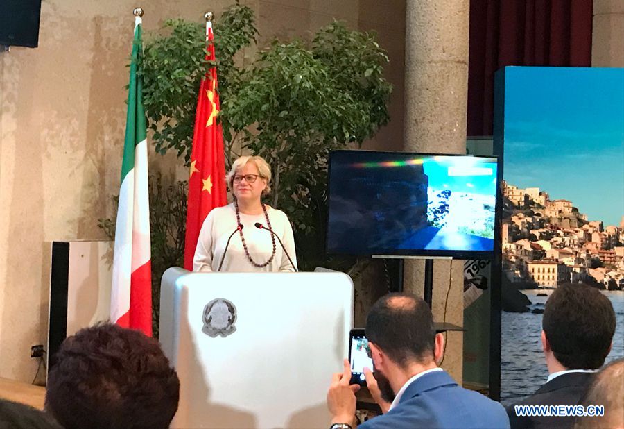 An Italian government official representing the region of Puglia speaks during a press conference on the launch of tourism cooperation between China International Travel Service Limited, Head Office (CITS) and four regions of Italy held in Beijing, capital of China, July 16, 2018. (Xinhuanet/Zhou Xin)