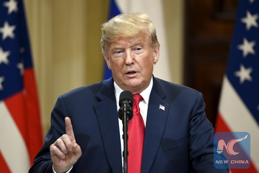 U.S. President DonaldTrump speaks during a joint press conference with Russian President Vladimir Putin (not in the picture) in Helsinki, Finland, on July 16, 2018. (Xinhua/Lehtikuva/Antti Aimo-Koivisto)