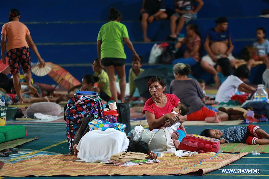 Residents take temporary shelter inside a covered basketball court as they evacuate from their homes due to the floods brought by tropical storm Son-Tinh in Quezon City, the Philippines, July 18, 2018. (Xinhua/Rouelle Umali)?