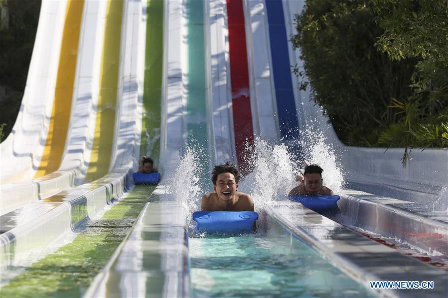 Tourists play at a water park in Jianhe County, southwest China's Guizhou Province, July 20, 2018. (Xinhua/Yang Jiameng)