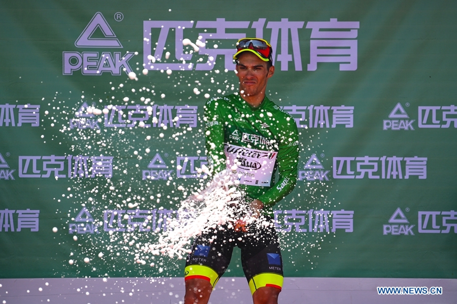 Luka Pacioni from Wilier Triestina-Selle Italia?celebrates with green jersey at the award ceremony of the tenth stage of the Tour of Qinghai Lake in northwest China's Gansu Province, on August 1, 2018.(Xinhuanet Photo by Yang Shoude)