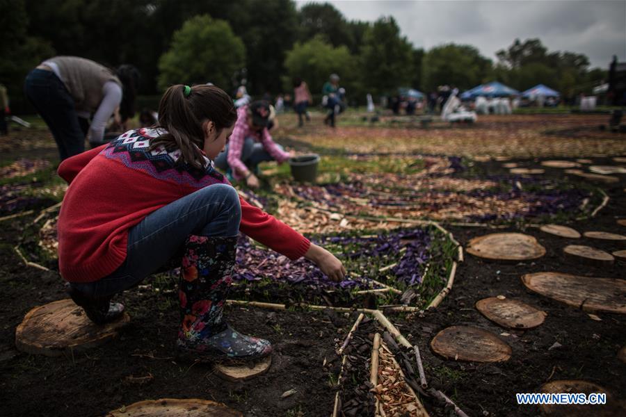 A girl makes a 2,500-square-meter flower carpet during the Flower Fair 2018 in Tepotzotlan, Mexico, on Aug. 4, 2018. (Xinhua/Miguel Tovar)?