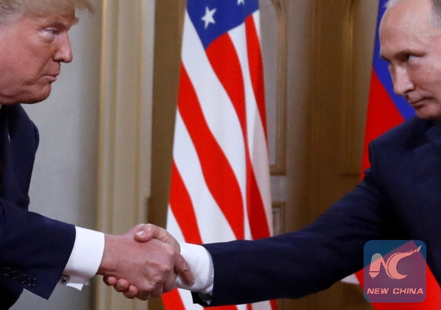 FILE PHOTO: U.S. President Donald Trump and Russia's President Vladimir Putin shake hands as they meet in Helsinki, Finland July 16, 2018. (Xinhua/REUTERS)