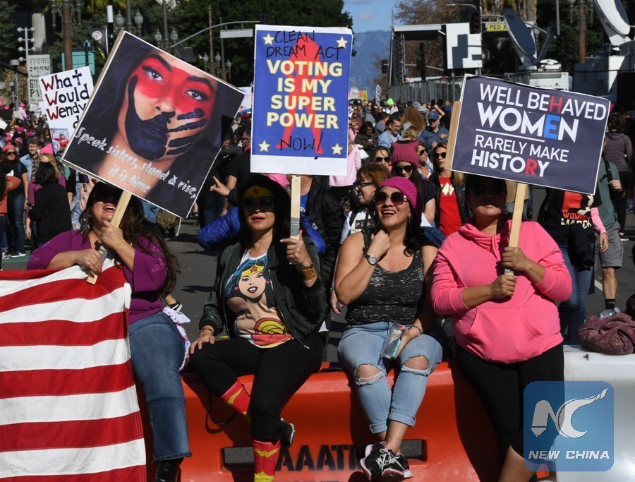 Protesters, part of a 500,000 strong crowd, take part in the Women's Rally on the one-year anniversary of the first Women's March, when millions marched around the world to protest U.S. President DonaldTrump's inauguration, in Los Angeles, California on January 20, 2018. (Xinhua/AFP PHOTO)