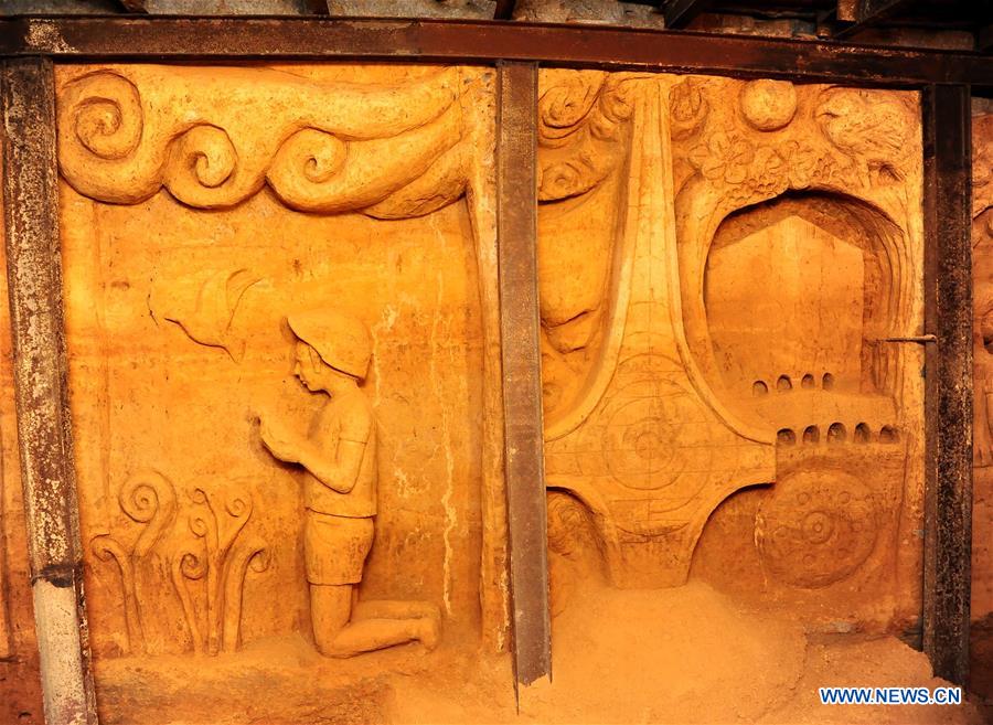 Walls of a formerly rebel-run underground tunnel are seen turned into sculptures by Syrian artists with scenes of battle and bravery in the Jobar neighborhood in the Eastern Ghouta countryside of the capital Damascus on Aug.14, 2018. Syrian artists have turned the tunnels into sculpture gallery after the defeat of rebels in Eastern Ghouta last April. (Xinhua/Ammar Safarjalani)
