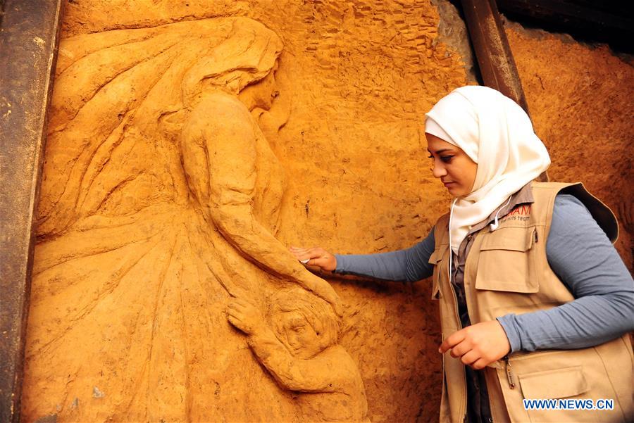 A Syrian artist works to perfect a sculpture on the wall of a formerly rebel-run underground tunnel in the Jobar neighborhood in the Eastern Ghouta countryside of the capital Damascus on Aug.14, 2018. Syrian artists have turned the tunnels into sculpture gallery after the defeat of rebels in Eastern Ghouta last April. (Xinhua/Ammar Safarjalani)