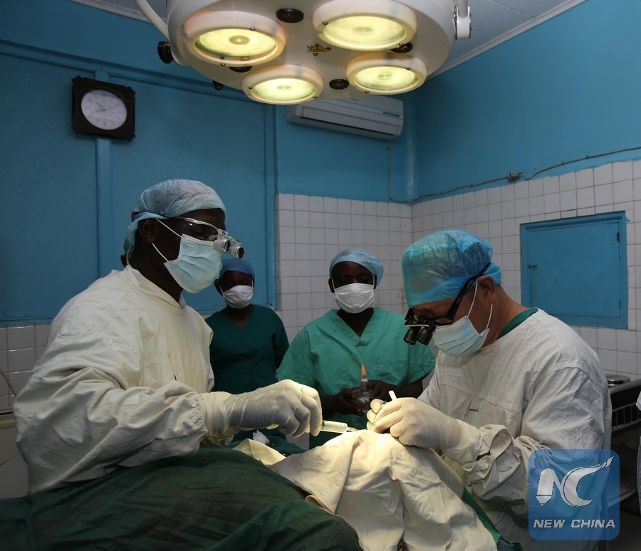 File photo taken on March 12, 2013 shows Chinese doctor Liang Weimin operates on a patient at a hospital in Brazzaville, capital of the Republic of Congo. In 1963, China's first foreign aid medical team arrived in Africa. For the past 50 years, Chinese government has sent 23,000 medical personnel to 66 countries and regions, most of which are African countries. (Xinhua/Meng Chenguang)