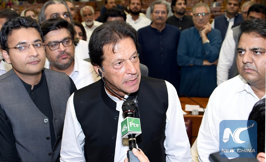 Photo released by Pakistan's Press Information Department (PID) on Aug. 17, 2018 shows Pakistan's newly-elected Prime Minister Imran Khan (C) addressing the lawmakers in Islamabad, capital of Pakistan. (Xinhua/PID)