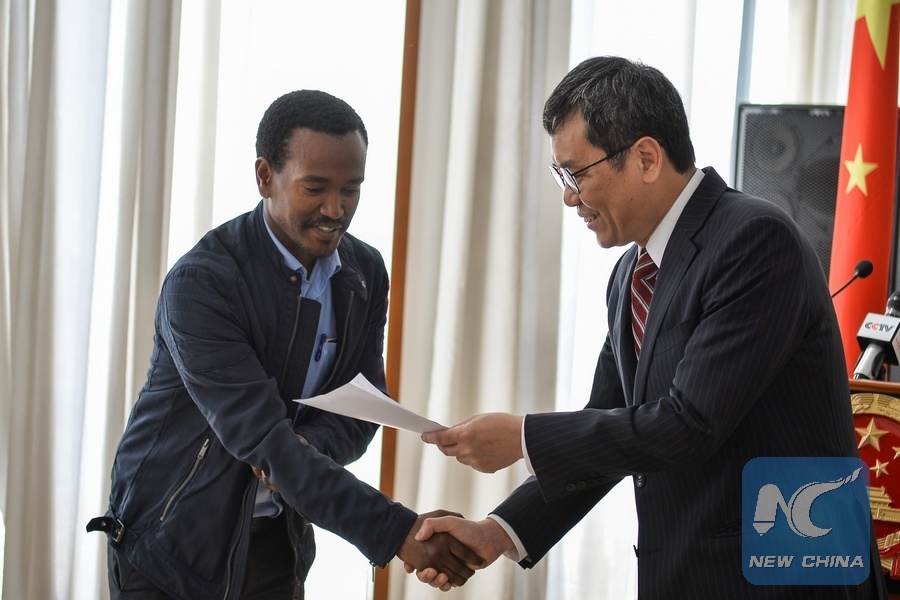 Tan Jian (R), Chinese Ambassador to Ethiopia awards an Ethiopian student a scholarship in Addis Ababa, capital of Ethiopia, Aug. 8, 2018. (Xinhua/Michael Tewelde)