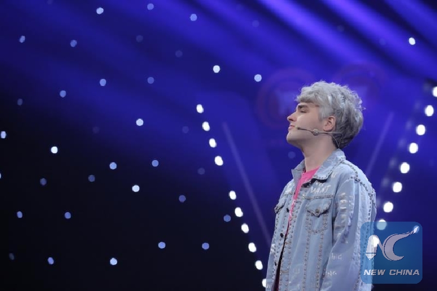 This photo, provided by Slater Rhea, shows he is giving performance on a game show taped in Spring 2018 in Hebei Province, north China.