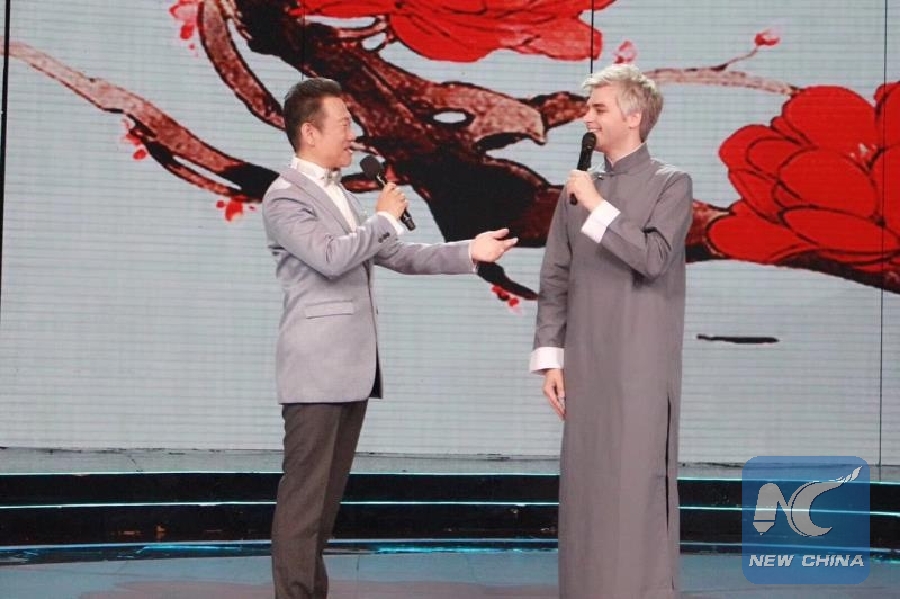 This photo, provided by Slater Rhea, shows Rhea together with Zhao Baole, a famous cross talk performer and CCTV host, on a CCTV show in Beijing in June 2018.