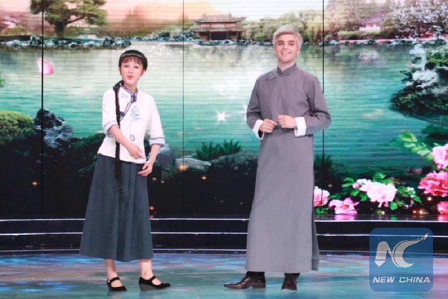 This photo, provided by Slater Rhea, shows Rhea on a CCTV show in June 2018 in Beijing together with a student of Huangmei Opera, Anhui's local opera.