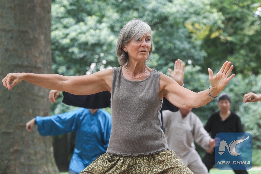 People learn Tai Chi at the Cinquantenaire park in Brussels, Belgium, Aug. 21, 2018. (Xinhua/Zheng Huansong)