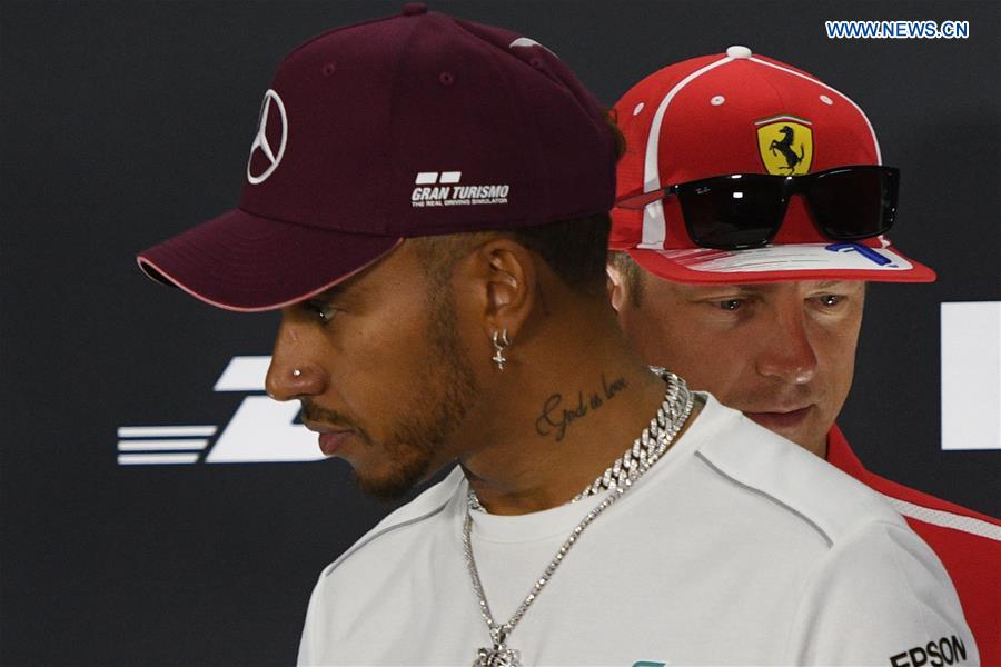 Lewis Hamilton (L) of Mercedes and Kimi Raikkonen of Ferrari attend the pre-race press conference of the F1 Singapore Grand Prix Night Race held in Singapore, on Sept. 13, 2018. (Xinhua/Then Chih Wey)