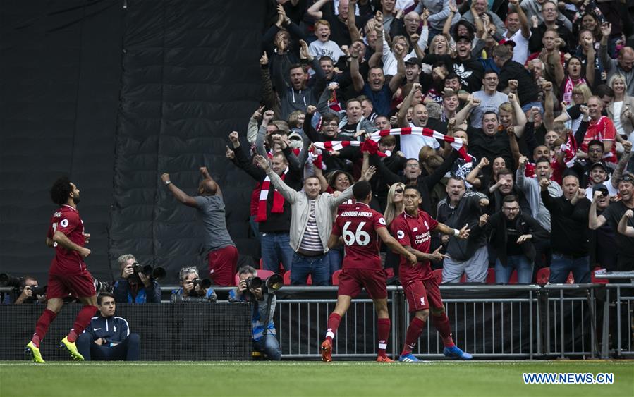 Liverpool's Roberto Firmino (R, Front) celebrates after scoring during the English Premier League match between Tottenham Hotspur and Liverpool at the Wembley Stadium in London, Britain on Sept. 15, 2018. Liverpool won 2-1. (Xinhua/Han Yan)