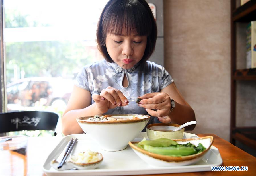 A customer tastes river snail rice noodles in a restaurant of Liuzhou, south China's Guangxi Zhuang Autonomous Region, Sept. 20, 2018. The harvest season of river snails in Liuzhou has begun. In recent years, the promotion of river snail rice noodles benefits over 4,500 impoverished households in Liuzhou. (Xinhua/Li Hanchi)