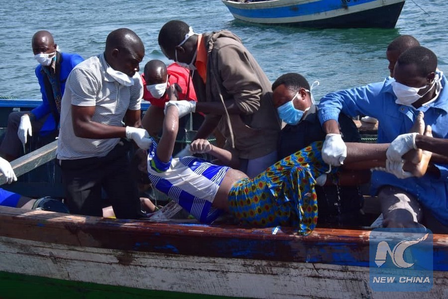 Photo taken on Sept. 21 shows the scene of rescue. According to sources, Tanzania's Lake Victoria passenger ferry, with a capacity of 101 passengers and 25 tonnes of cargo, capsized at around 1:00 p.m. local time Thursday. (Xinhua)