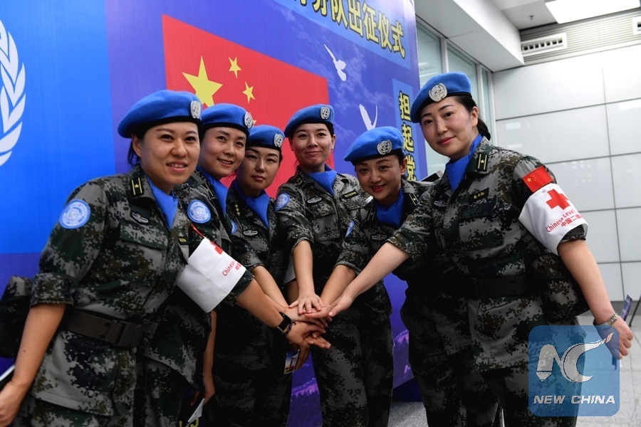 Chinese female peacekeepers pose for photos before leaving for South Sudan from Zhengzhou, capital of central China's Henan Province, Sept. 21, 2017. The 105-member squad of Chinese peacekeepers left for Wau in South Sudan on a one-year peacekeeping mission. (Xinhua/Zhu Xiang)