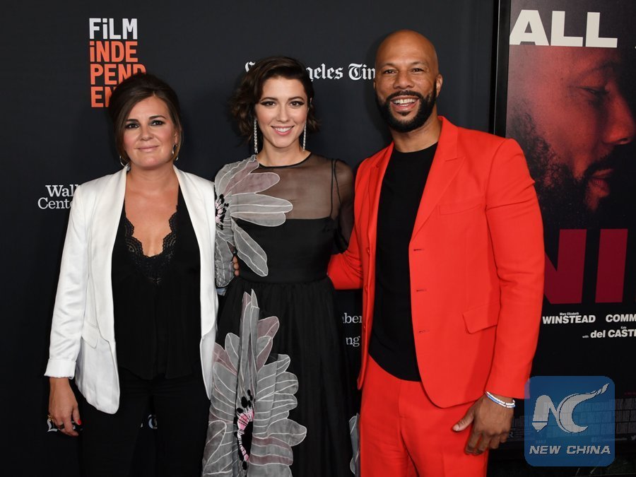 Director Eva Vives (L) and actors Mary Elizabeth Winstead (C) and Common arrive for the LA Film Festival screening of "All About Nina" at the Wallis Annenberg Center for Performing Arts in Beverly Hills, California on Sept. 23, 2018. (Xinhua/AFP)