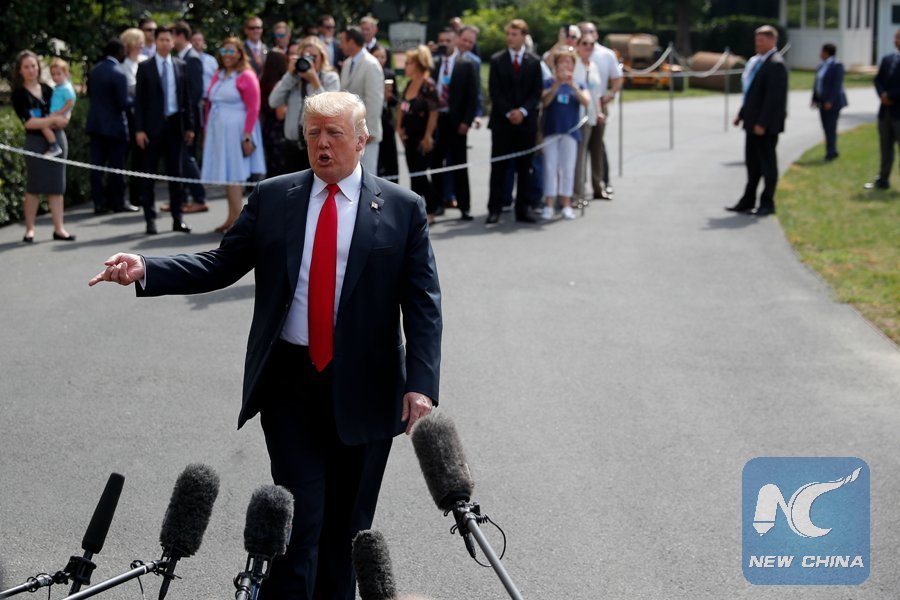 U.S. President Donald Trump speaks to reporters before leaving the White House in Washington D.C., the United States, Aug. 17, 2018. (Xinhua/Ting Shen)