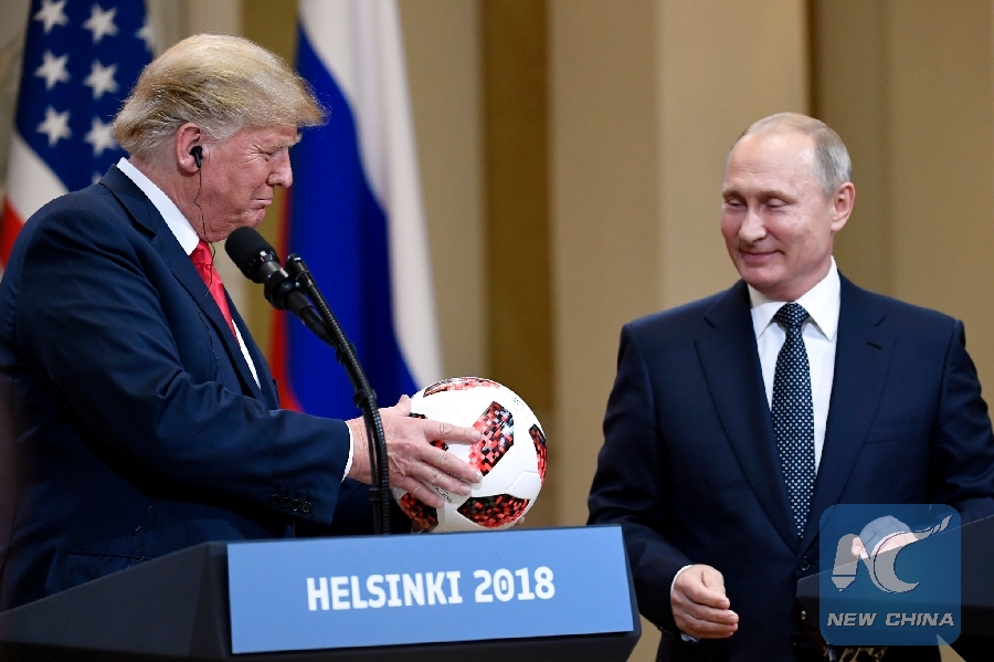 File Photo: U.S. President Donald Trump (L) holds a soccer ball during a joint press conference with Russian President Vladimir Putin in Helsinki, Finland, on July 16, 2018. (Xinhua/Lehtikuva/Antti Aimo-Koivisto)