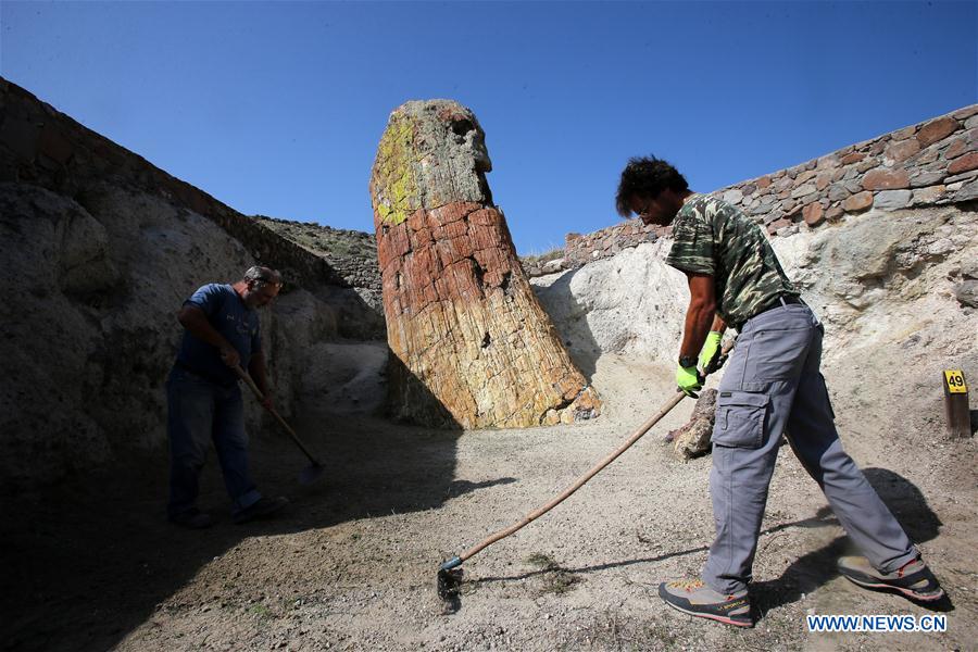 Workers clear the area around petrified tree trunks in the Petrified Forest near Sigri village, Lesvos island, Greece on Oct. 20, 2018. The entire Lesvos island in the northeastern Aegean Sea has been designated as one of the 140 UNESCO Global Geoparks worldwide on account of its outstanding geological, cultural and ecological heritage and efforts to preserve and promote it over the past three decades. (Xinhua/Marios Lolos)