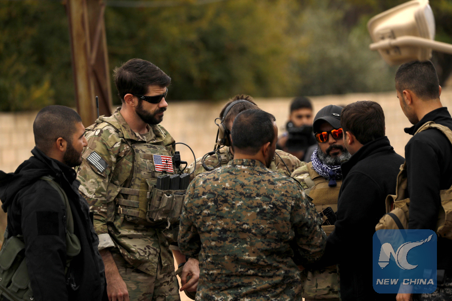 Members of the Syrian Democratic Forces (SDF) and U.S. soldiers gather in the Kurdish-held town of Al-Darbasiyah in northeastern Syria bordering Turkey on Nov. 4, 2018. (AFP photo)