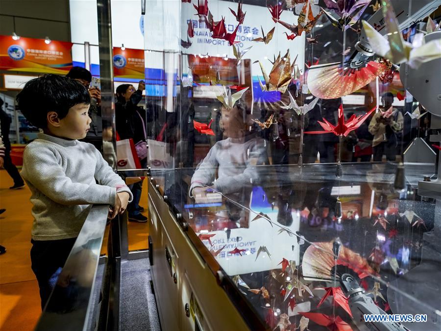 A child watches a robot dancing with a fan at the booth of Mitsubishi during the first China International Import Expo(CIIE) in Shanghai, east China, Nov. 10. 2018. The CIIE concluded here on Saturday. (Xinhua/Shen Bohan)