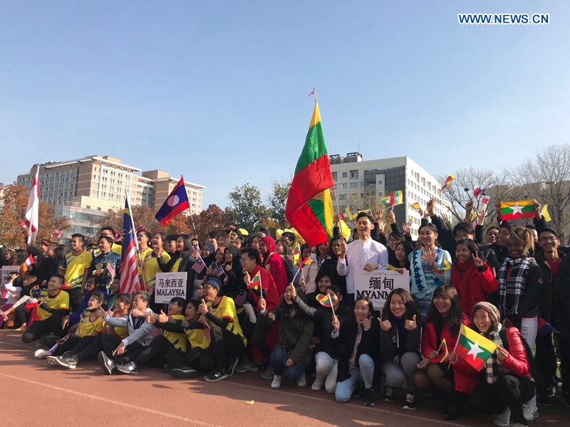 Student athletes from ASEAN countries pose for a group photo at the opening ceremony of the 4th Beijing ASEAN Students' Games in Beijing, capital of China, Nov. 10, 2018. (Xinhuanet/Zhou Xin)