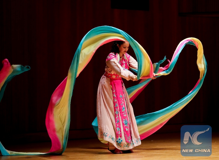 Carrie Feyerabend from the Confucius Institute of Chinese Opera (CICO) at Binghamton University (BU) performs The Heavenly Maid Scatters Blossoms during the show titled "Amazing Chinese Opera" at the University at Buffalo in Buffalo city of New York State, the United States, Nov. 16, 2018. (Xinhua/Wang Ying)