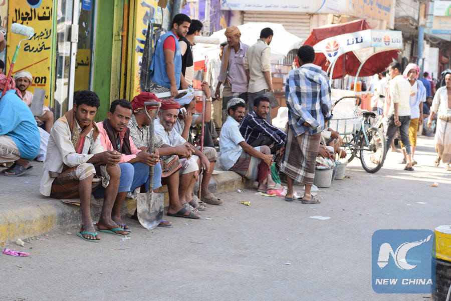 A small group of people sit on the pavement and wait for getting a chance for physical works in construction in Aden city, Yemen, on November 20, 2018. (Xinhua/Murad Abdu)