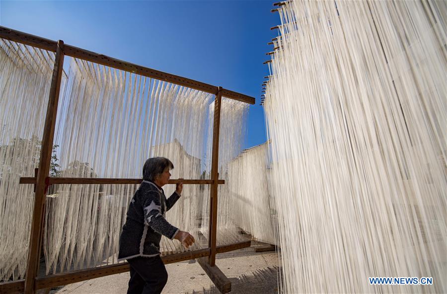 A villager dries noodles in Wangjiaxia Village, Xinyu City of east China's Jiangxi Province, Nov. 27, 2018. As traditional food in Wangjiaxia Village, handmade noodles have brought increase to local farmers' income. (Xinhua/Zhao Chunliang)