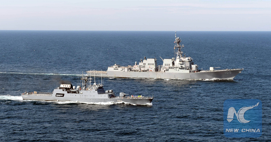 In this April 5, 2015 U.S. Navy handout image, the USS Jason Dunham (R) and the Romanian corvette ROS Sebastian operate together during a passing exercise in the Black Sea.