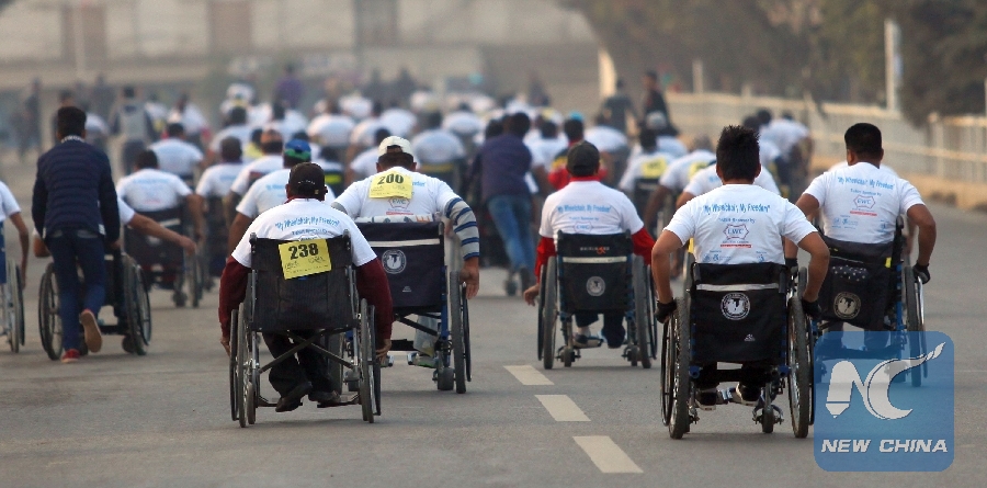 People with disabilities compete in the 4km "Wheelchair Marathon" in Kathmandu, Nepal, March 4, 2017. (Xinhua/Sunil Sharma)