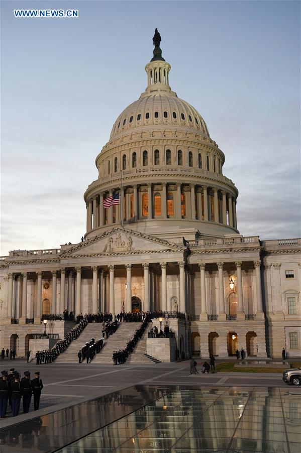 The casket of late former U.S. President George H.W. Bush is carried to the entrance of the U.S. Capitol, where it will lie in state, in Washington D.C., the United States, on Dec. 3, 2018. George H.W. Bush, the 41st president of the United States, died on Nov. 30 at the age of 94. (Xinhua/Liu Jie)