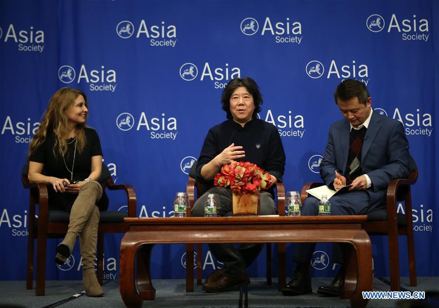 Chinese theatrical director Meng Jinghui (C) speaks during a pre-performance discussion at Asia Society in New York, the United States, on Dec. 15, 2018. Directed by Chinese theatrical director Meng Jinghui and starring actress Huang Xiangli, the compelling solo performance "Nine and a Half Love" was staged at Asia Society in New York on Saturday, as part of the Creative China Festival 2018. (Xinhua/Qin Lang)