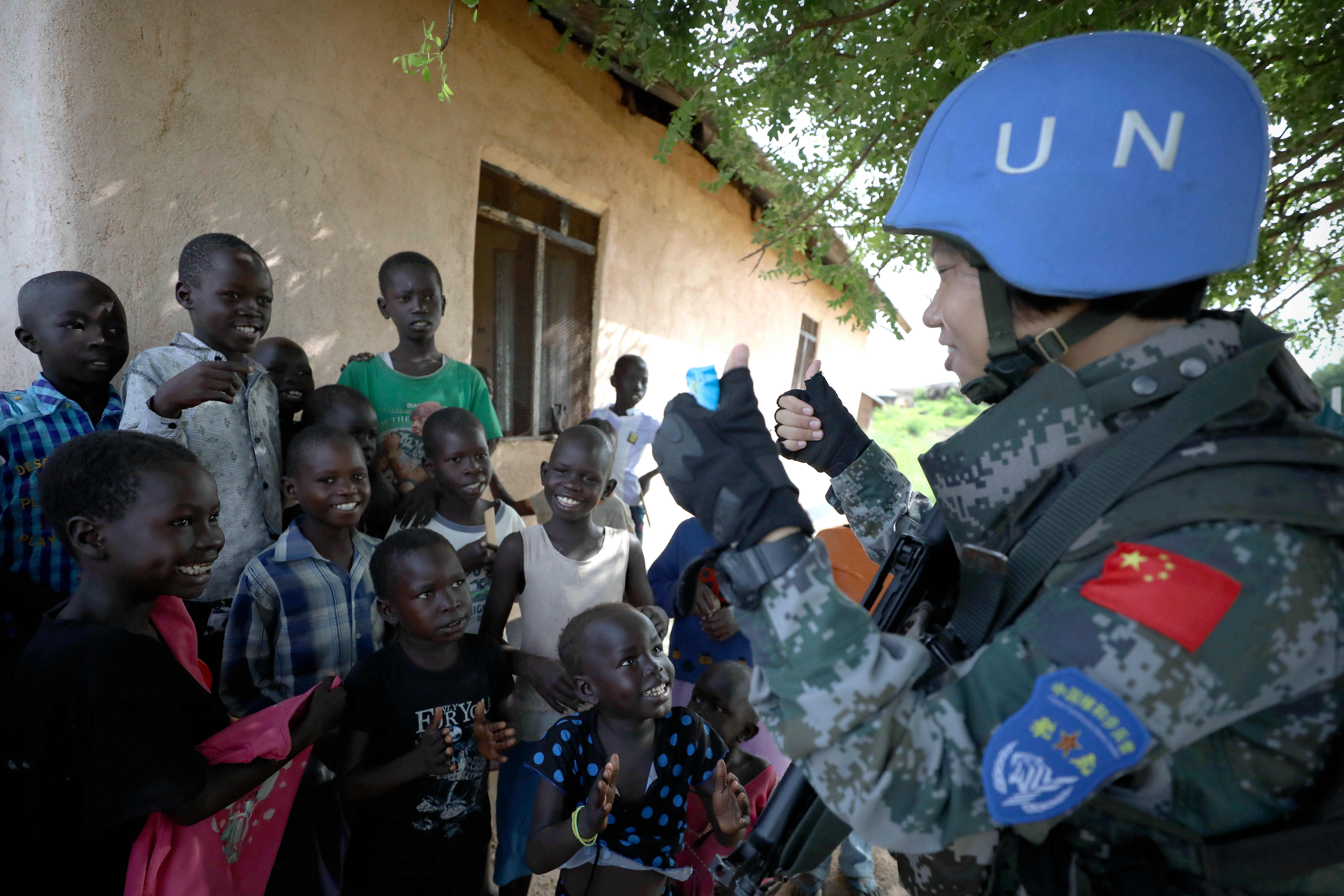 Chinese peacekeeper Yu Peijie (R) sings songs with local children in Juba, South Sudan, on April 30, 2018. (Xinhua/Wang Teng)